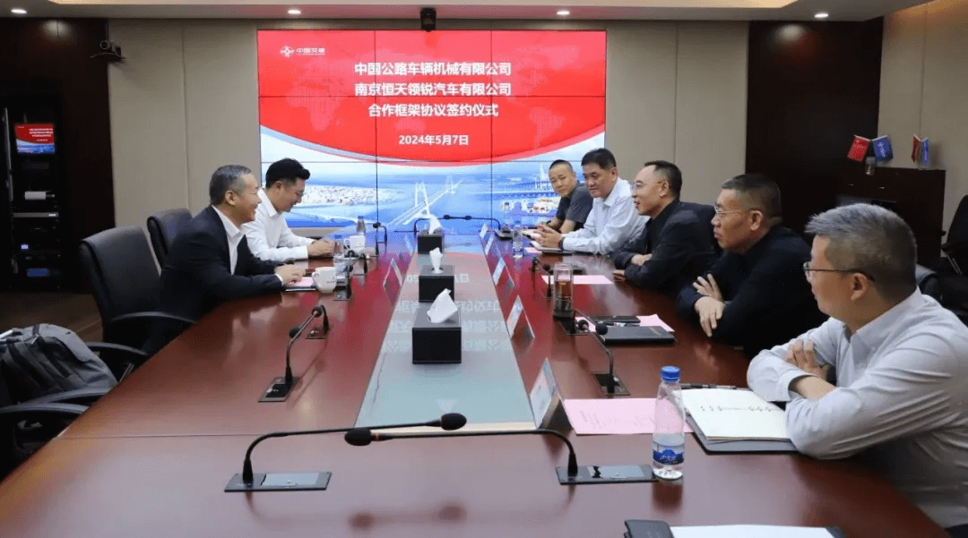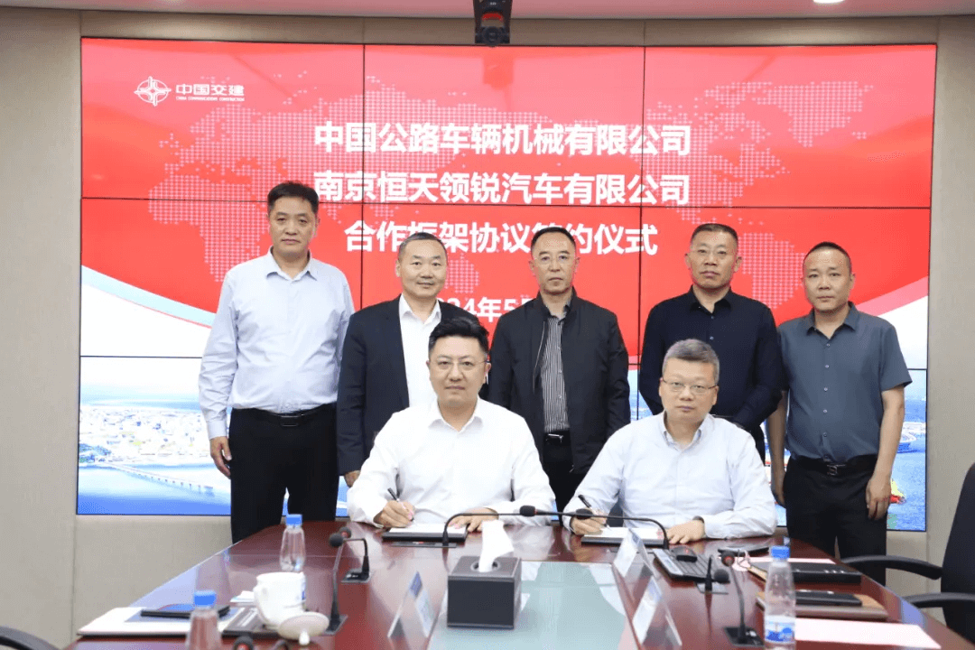 5月7日,南京恒天領銳汽車有限公司與中國公路車輛機械有限公司正式簽署框架合作協議。恒天領銳董事長汪先鋒、銷售公司總經理馬志鵬與中國公路車輛機械有限公司黨委書記宋金剛、副總經理李永、新興產業事業部總經理張永強、重慶分公司總經理李明、重慶分公司執行總經理周磊出席簽約儀式。