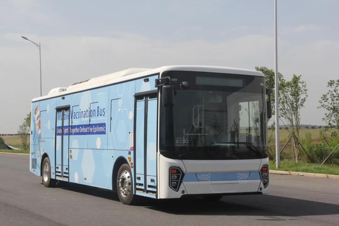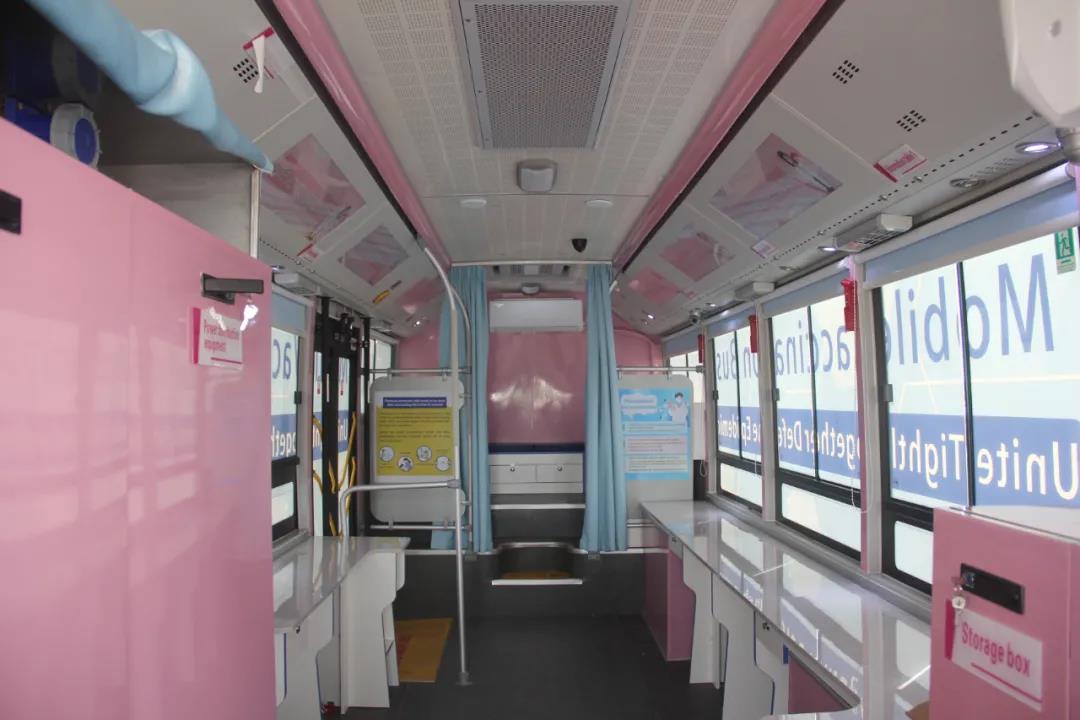 這款純電動疫苗接種車由衡陽智電客車聯合南華大學設計研發,是一款移動式純電動低入口智慧疫苗接種車。該車在10.5米低入口純電動城市客車的基礎上,根據新冠疫苗接種的相關技術規范進行設計,方便鄉村疫苗接種。
